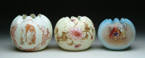 THREE ROSE BOWLS. Lot consists of a custard glass rose bowl with a transfer and enamel decoration of an Egyptian scene, a blue satin rose bowl with a transfer decoration of two seated figures and a satin glass rose bowl with an enamel decoration of chrysanthemums. SIZE: Range from 5 in. to 6 in. dia. CONDITION: The blue rosebowl has a chip to rim and the Egyptian scene has wear to decoration. Slight wear to gold around edges, otherwise very good to excellent. Collection of Johanna and Sean Billings 5-60900, 5-60925, 5-60935