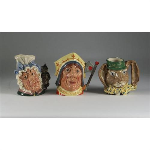 PORCELAIN: Three Royal Doulton porcelain large size character jugs with the Alice in Wonderland theme. The first is, ''The Cook And The Cheshire Cat'', D6842, 1989, 6.75'' x 6.5'' x 4.25''. The second is ''The March Hare'', D6776, 1988, 5.75'' x 7'' x 4''. The third is ''The Red Queen'', D6777, 1987, 8'' x 7.5'' x 4.75''.