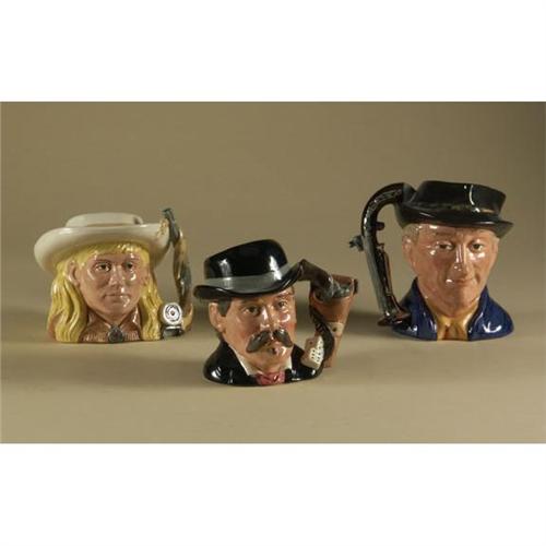 PORCELAIN: Three Royal Doulton character jugs to include ''The Antique Dealer'', signed, D6807, 6.6'', 1988, ''The Wild West Collection Annie Oakley'' D6732, 5'', 1985, and ''The Wild West Collection Doc Holliday'', D6731, 5.5'', 1985, no chips, cracks, or crazing noted.