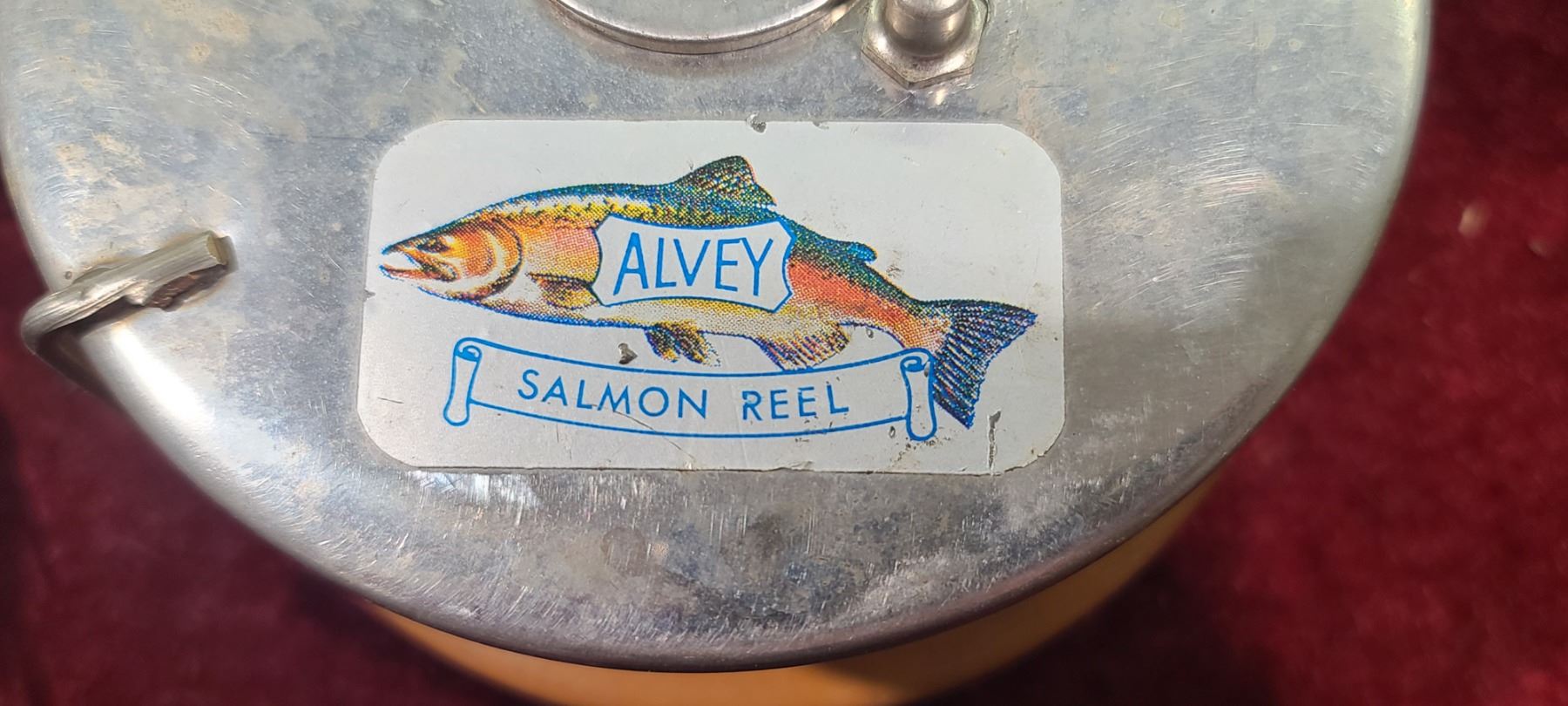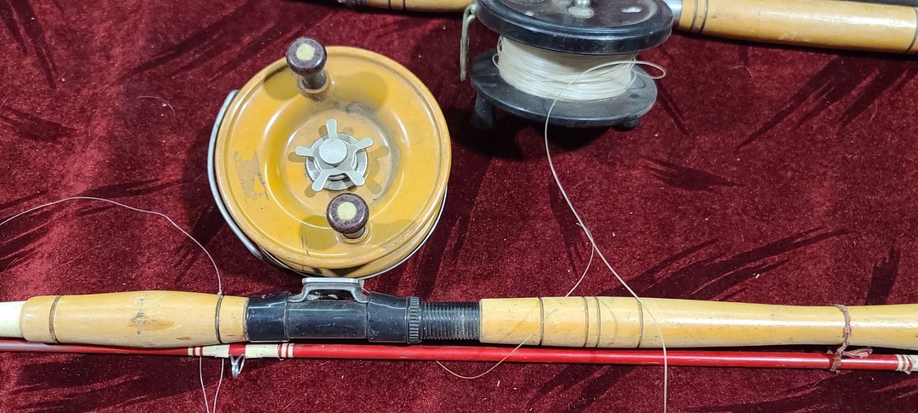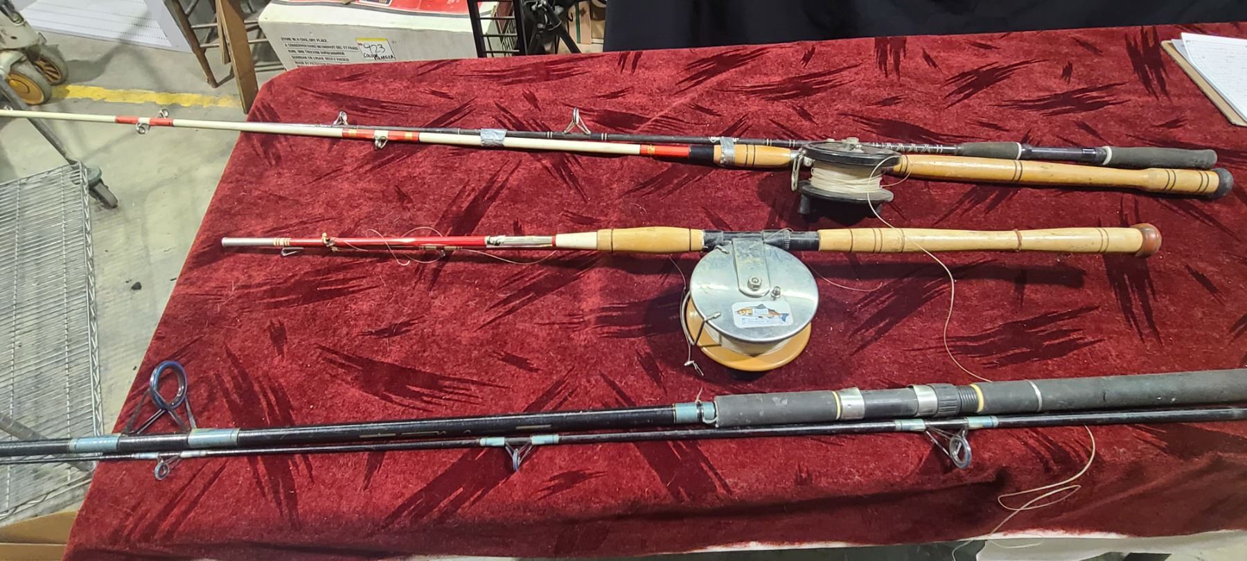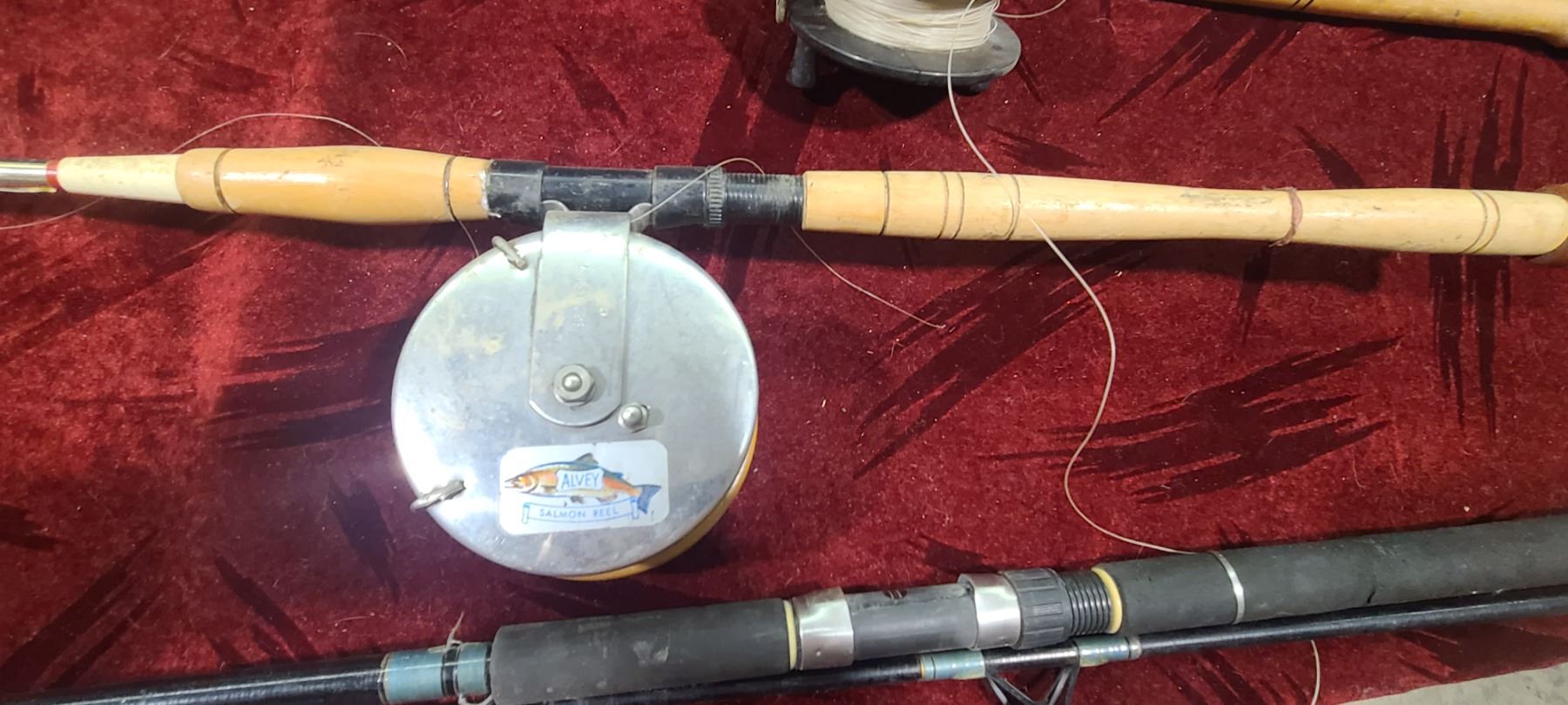 THREE SALMON RODS AND TWO REELS. ALVEY SALMON REEL AND STEELITE ROD AND REEL, AS WELL AS SHAKESPEARE ROD