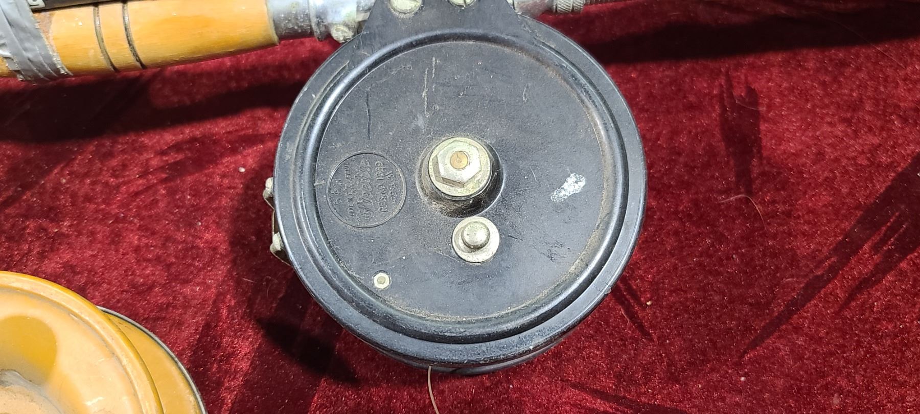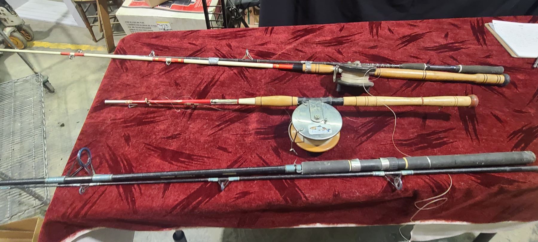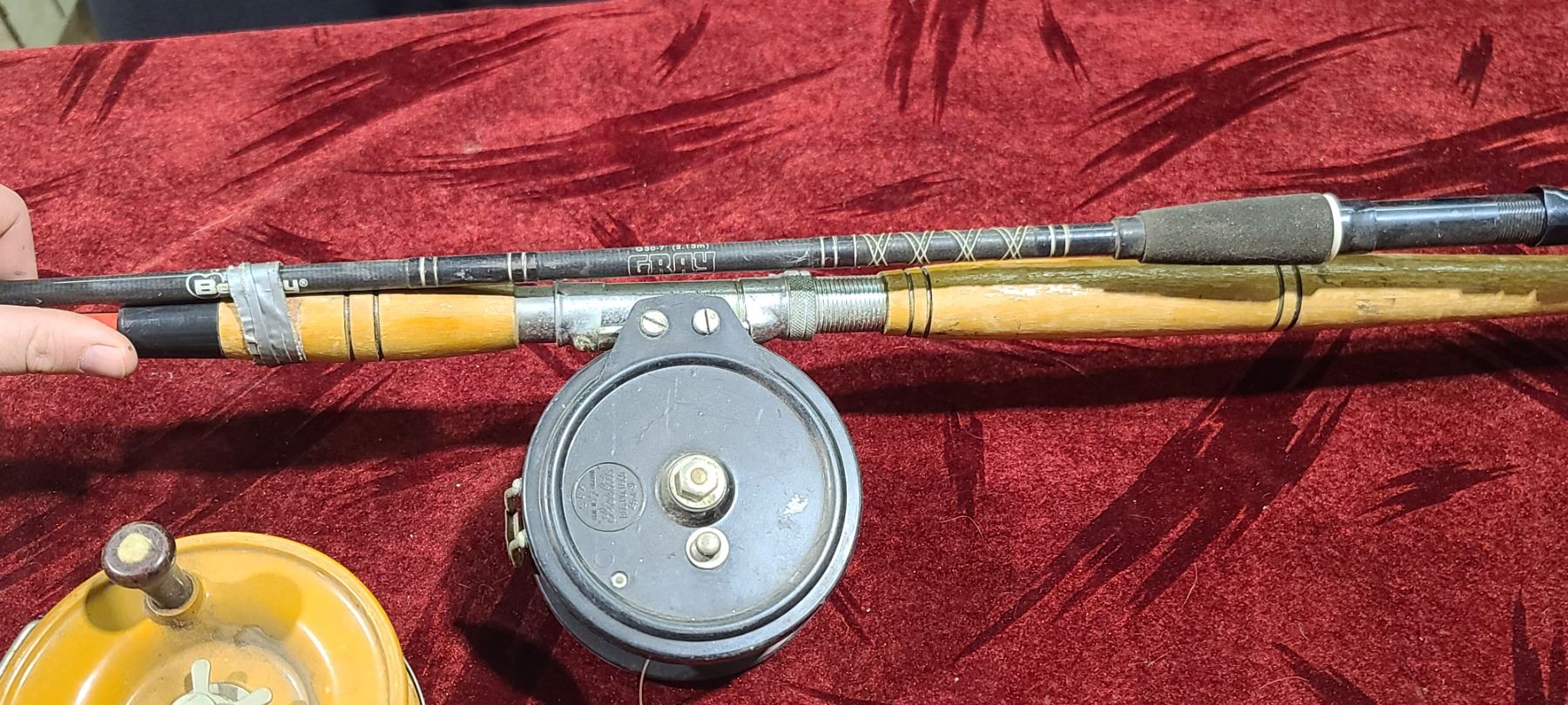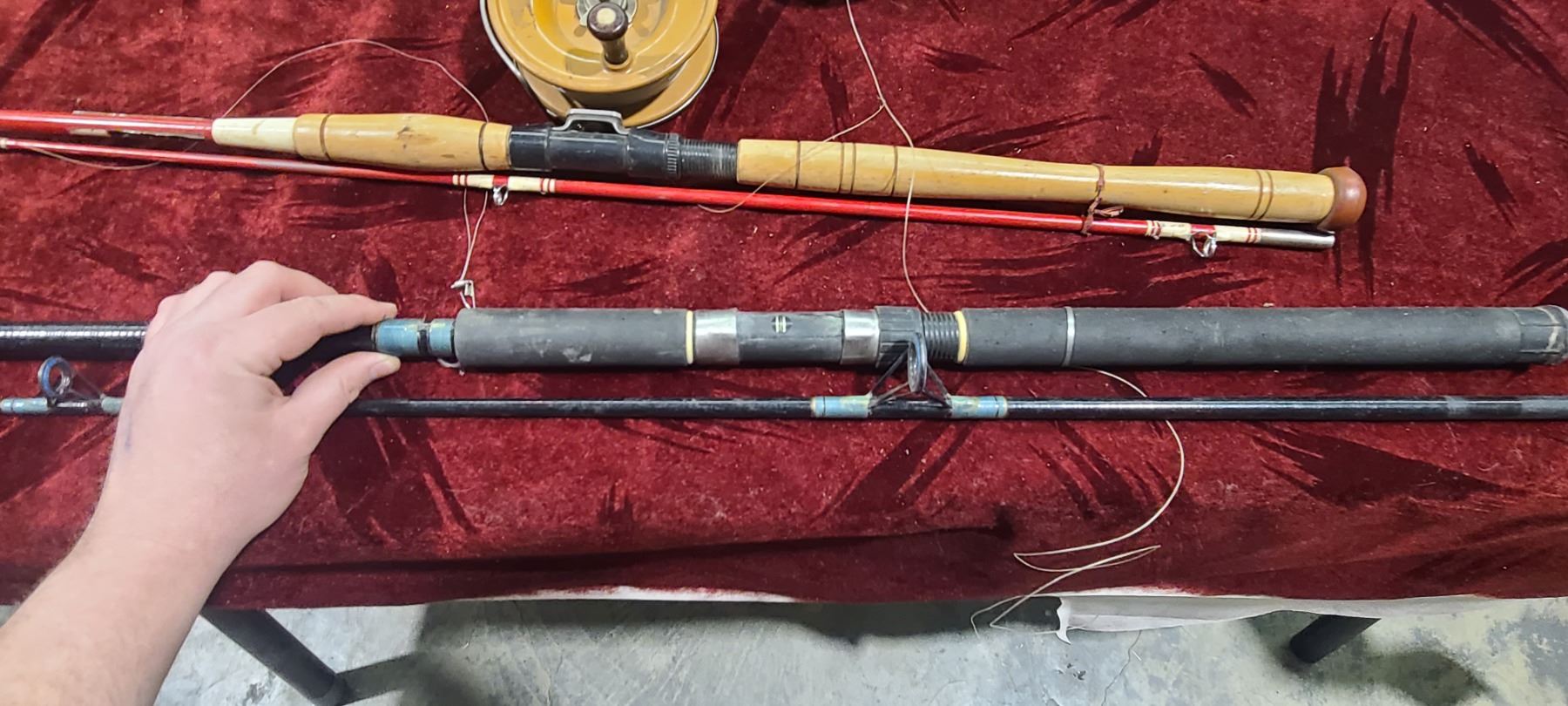 THREE SALMON RODS AND TWO REELS. ALVEY SALMON REEL AND STEELITE ROD AND REEL, AS WELL AS SHAKESPEARE ROD