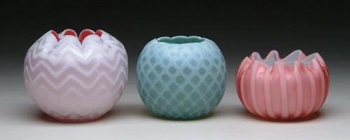 THREE SATIN GLASS ROSE BOWLS. Lot consists of a blue D.Q. uncased rose bowl, a pink ribbon pattern MOP satin glass rose bowl with a white cased lining and a white MOP herringbone pattern satin glass rose bowl with a pink cased lining. All are pictured in the "Collectible Glass Rose Bowls" by Johanna Billings fig. 78 pg. 36, fig. 99 pg. 41 and fig. 81 pg. 36. Accompanying lot is an autographed copy of "Collectible Glass Rose Bowls" by Johanna Billings with Sean Billings. SIZE: Range from 3-1/2 in. to 4 in. dia. CONDITION: Very good to excellent. Collection of Johanna and Sean Billings 5-60926, 5-60942, 5-60960