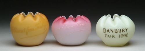 THREE SATIN GLASS ROSE BOWLS. Lot consists of three Victorian art glass rose bowls. One is apricot with a white lining and an enameled inscription in.A Present From Tenby in., a pink satin rose bowl with enameled decoration "A Present From Ventnor" and a pale green satin rose bowl with painted decoration "Danbury Fair 1896". SIZE: Approx. 4-1/4 in. dia. CONDITION: Very good to excellent. Collection of Johanna and Sean Billings 5-60866