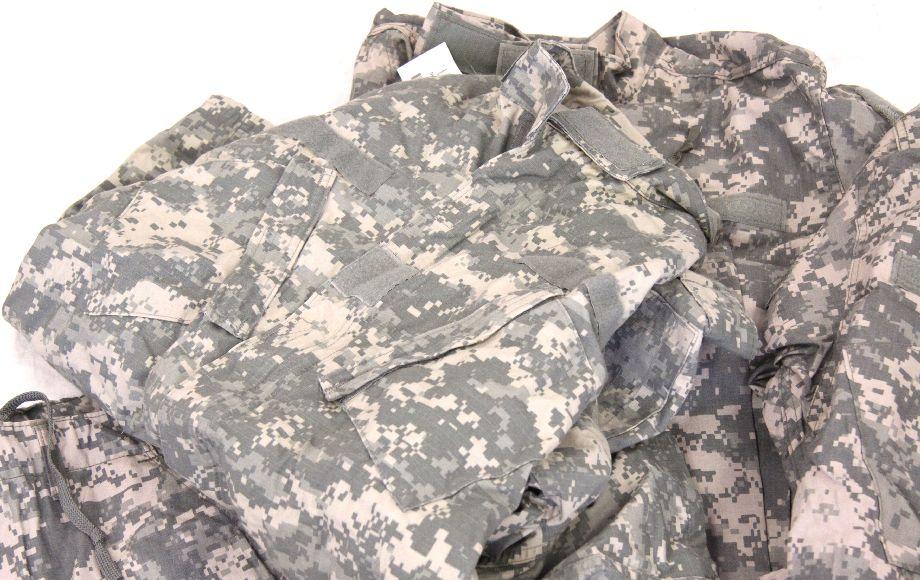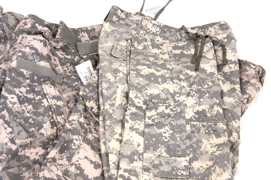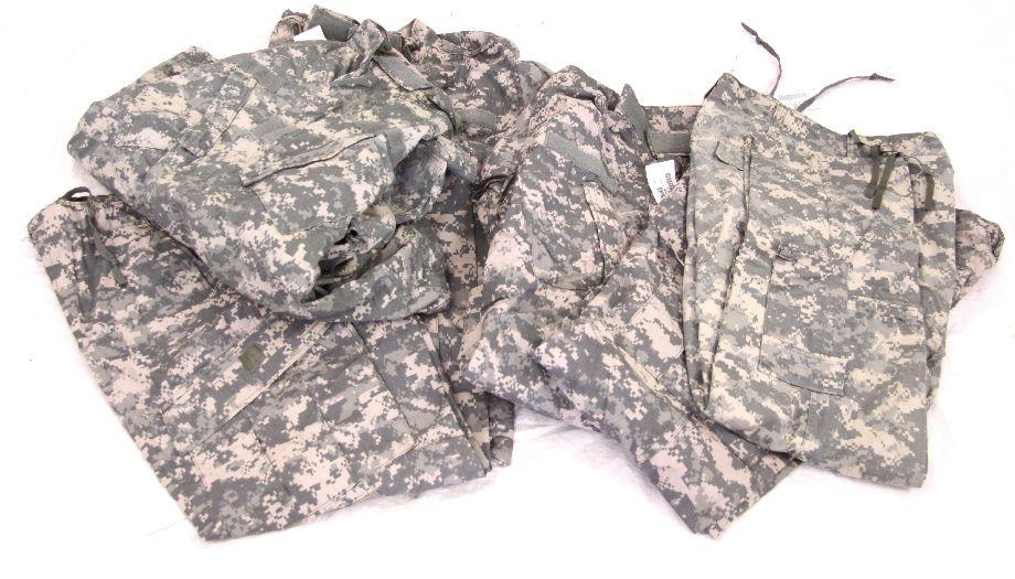 Three sets of US issue Army Combat Uniform shirts and trousers, in digital camouflage pattern. All are size medium long. Two sets are new with tags, one set appearing lightly used. Overall very good condition.