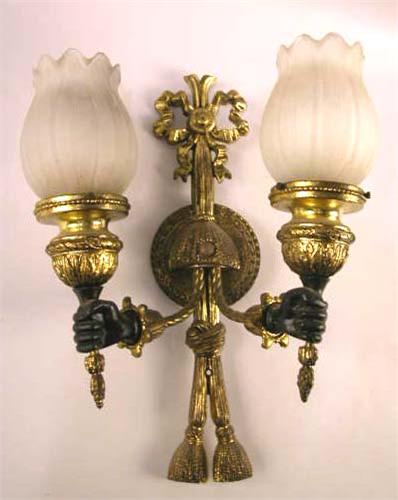 THREE SETS OF PATINATED METAL TWO LIGHT WALL SCONCES; Ribbon form finial above two hand form sconces