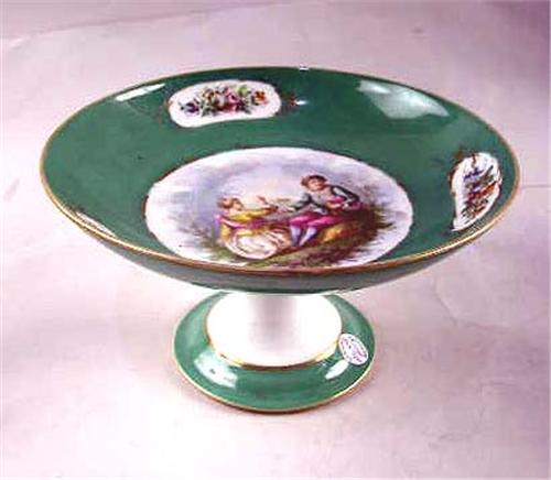 THREE SEVRES GREEN AND WHITE DECORATED PICTORIAL FOOTED COMPOTES; 5"h x 8 1/2"dia., losses