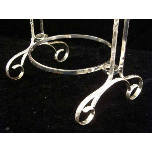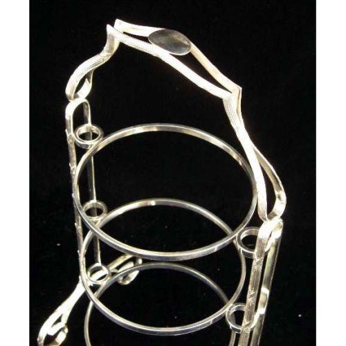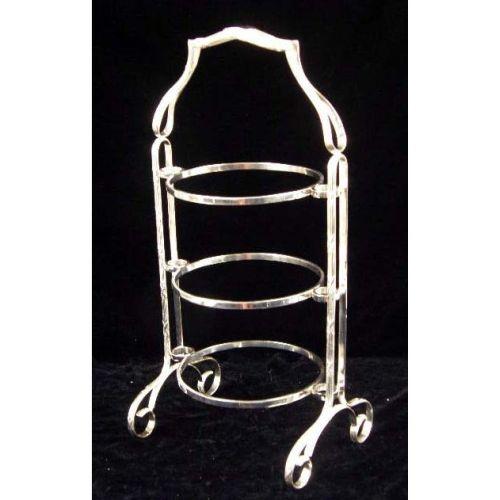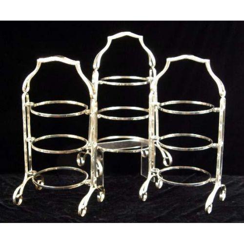 THREE SILVER PLATED HANDLED TIERED CAKE STANDS<BR><BR>Each 19"high