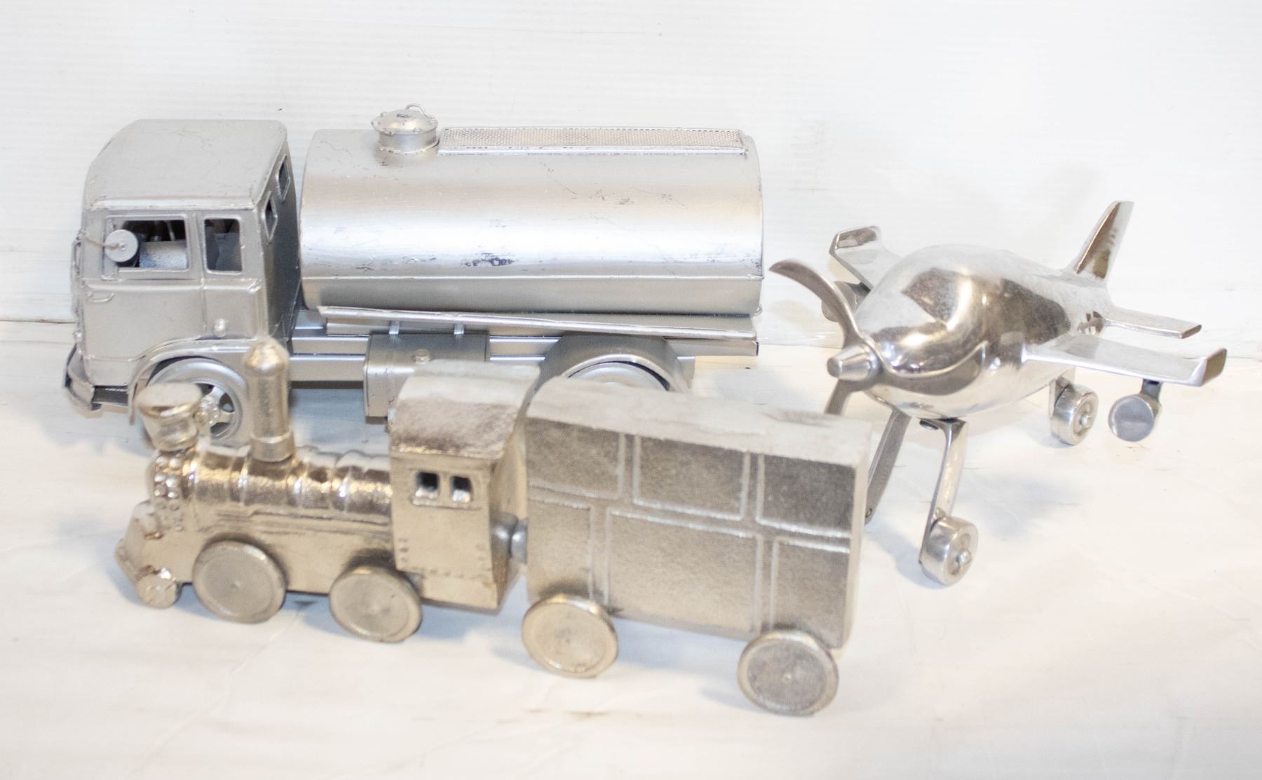 THREE SILVER TONED DECOR PIECES - PLANE, TRAIN AND