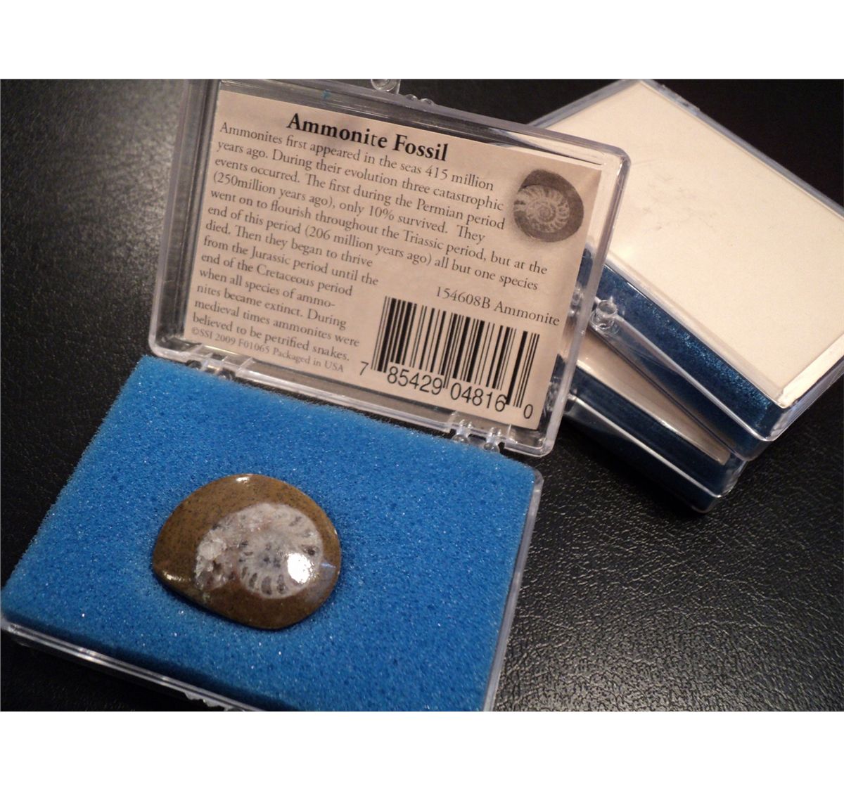 THREE SMALL AMMONITE FOSSILS IN DISPLAY BOX