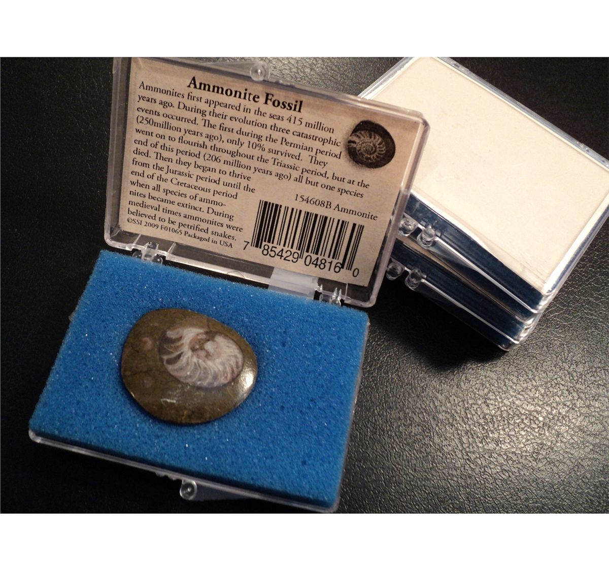 THREE SMALL AMMONITE FOSSILS IN DISPLAY BOX