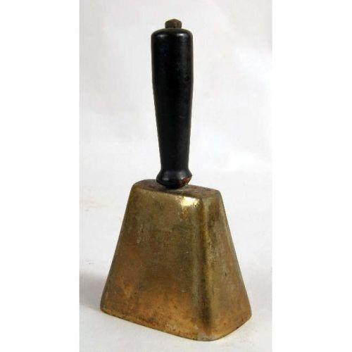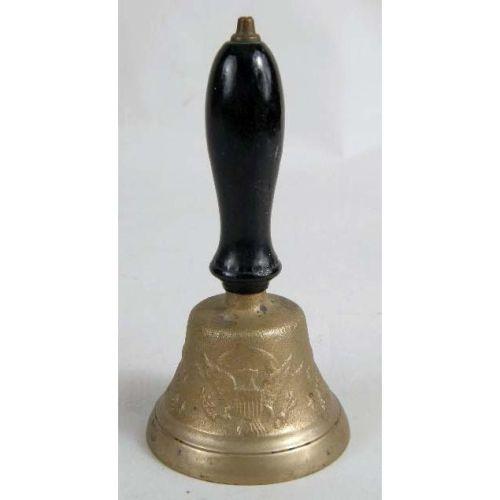 THREE SMALL HAND BELLS<BR><BR>one of brass embossed with American eagles, one of copper in a cowbell-shape, the third a brass schoolhouse bell