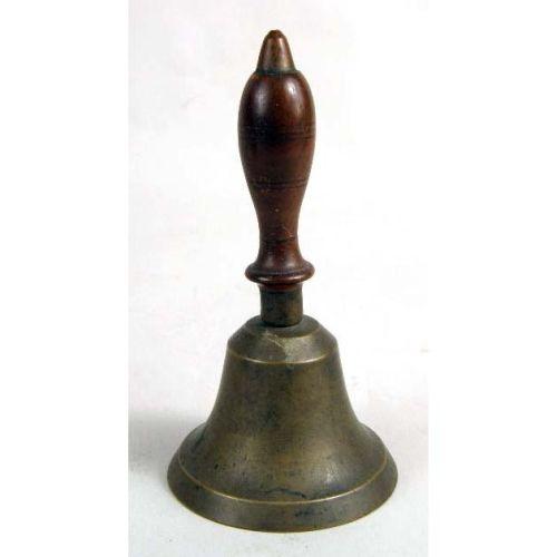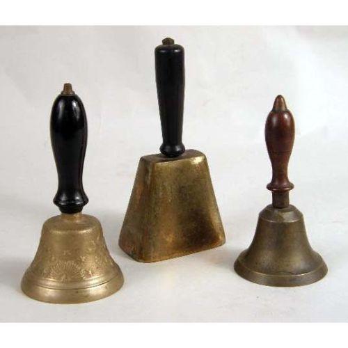 THREE SMALL HAND BELLS<BR><BR>one of brass embossed with American eagles, one of copper in a cowbell-shape, the third a brass schoolhouse bell