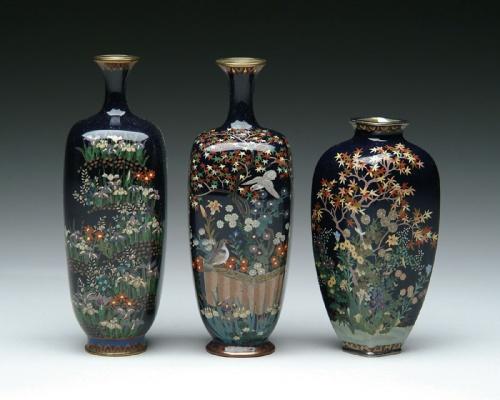 THREE SMALL JAPANESE CLOISONNE ENAMEL VASES. All with flower garden motifs on blue grounds. SIZE: 6-1/4 in., 6-1/4 in. and 4-3/4 in. t. CONDITION: Very good to excellent. Estate of Jon Heiden and Donald Mooers 5-60708, 5-60771, 5-60778