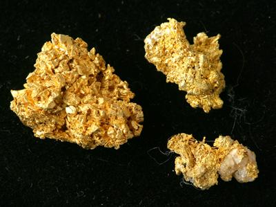 THREE SMALL PIECES OF CRYSTALLINE GOLD. The three specimens weigh 0.60 troy ounces combined. From the Round Mountain Mine, Nye County, Nevada.