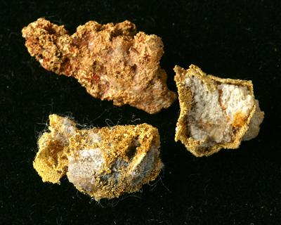 THREE SMALL SPECIMENS OF CRYSTALLINE GOLD. These pieces are from Olliinghousse, Washoe County, Nevada. They are from an old collection, and were probably collected between 1910 and 1920. They weigh 0.63 troy ounces. Note the ultra fine nature of the crystals, which in some cases appear as needles. Ollinghouse is a mining camp about thirty minutes drive East of Reno. It was in its heyday in the post-1900 Nevada Gold Rush.