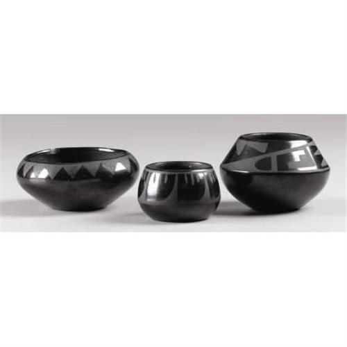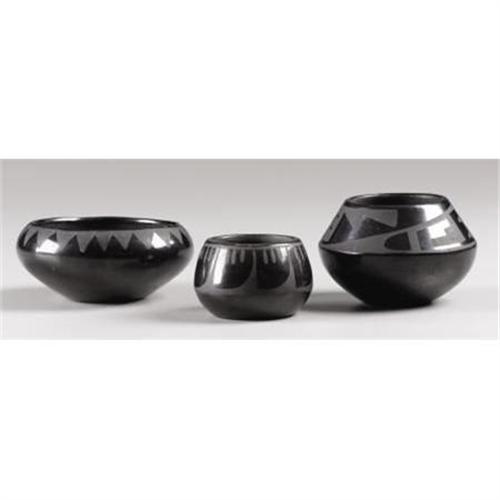 <B>THREE SOUTHWEST BLACKWARE JARS</B></I><BR><BR>c. 20th century two San Ildefonso, one with a serrated band painted around the rim, signed <I>Marie</B></I>; and the other with a band of geometric elements encircling the shoulder, signed <I>Marie and Julian</B></I>; and one Santa Clara, with a series of abstract feather motifs painted below the rim, signed <I>Severa, Sta. Clara</B></I><BR><BR>Provenance: <BR>Bessie Heard, McKinney, TX<BR>Bessie Heard Trust<I></B></I><BR><BR>Diameters: ranging from 3 to 4 1/2 inches <B>Condition Report:</B> Overall very good. Bowl on far left in image has chip on rim approx. 1/8" . Surfaces slightly scratched. Numbered in white on bases. No apparent restoration.<BR><BR><b>Shipping:</b> Hollowware/Pottery/Glass, Small (<a target="_blank" href="http://www.heritageauctions.com/common/shipping.php">view shipping information</a>)