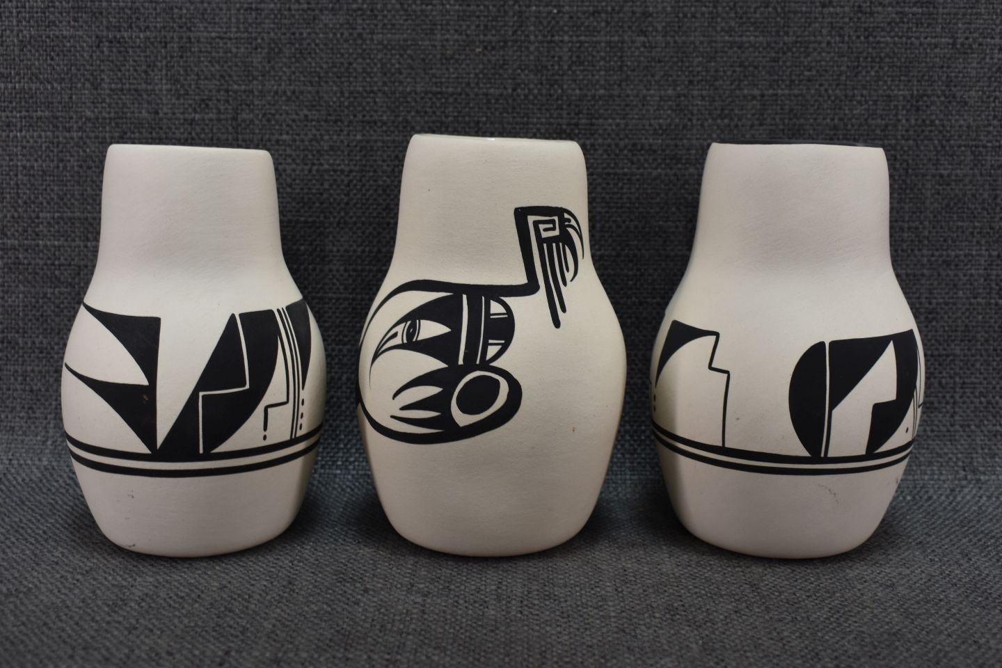 1980's ceramic pitchers with southwest design one signed N.L. other two signed Ute mtn Tribe IH 4.75" x 3.5"