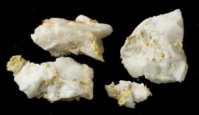 THREE SPECIMENS OF CALIFORNIA GOLD. Three nice specimens of classic California gold in quartz from Amador County. As a group. they weigh 5.05 troy ounces. The measured specific gravity of this group is 3.1 (weight in water is 107.1 grams and the dry weight 156.9 grams). The calculated gold content is 1.09 troy ounces.