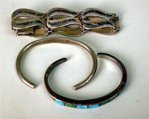 Comprising two bangle one with channel set turquoise, and a link bracelet set with abalone shell, 7 1/2"l.
