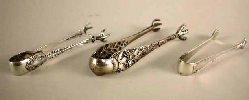 THREE STERLING SILVER SUGAR TONGS; Including: Kirk, 4-3/4" and Durgin