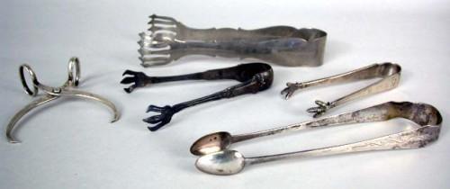 THREE STERLING SILVER SUGAR TONGS; Together with two silver plated sugar tongs apx. 3 T.O.