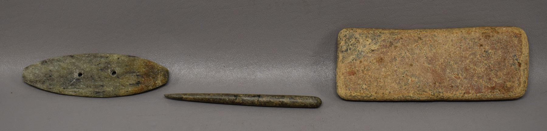 age unknown stone awl 4.5" stone with pump drilled holes 1.25" x 4.25" rectangle 2" x 5.5"