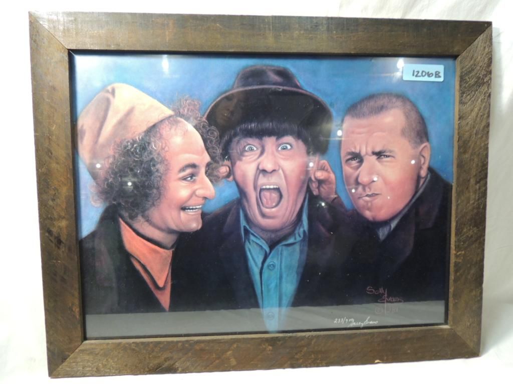 233/900 SALLY EVENS THREE STOOGES PAINTING. FRAMED RUSTIC WOOD FRAME. AS SHOWN SEE PHOTO FOR MORE DETAILS.