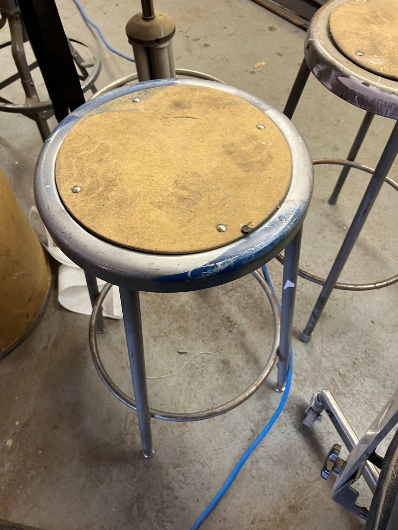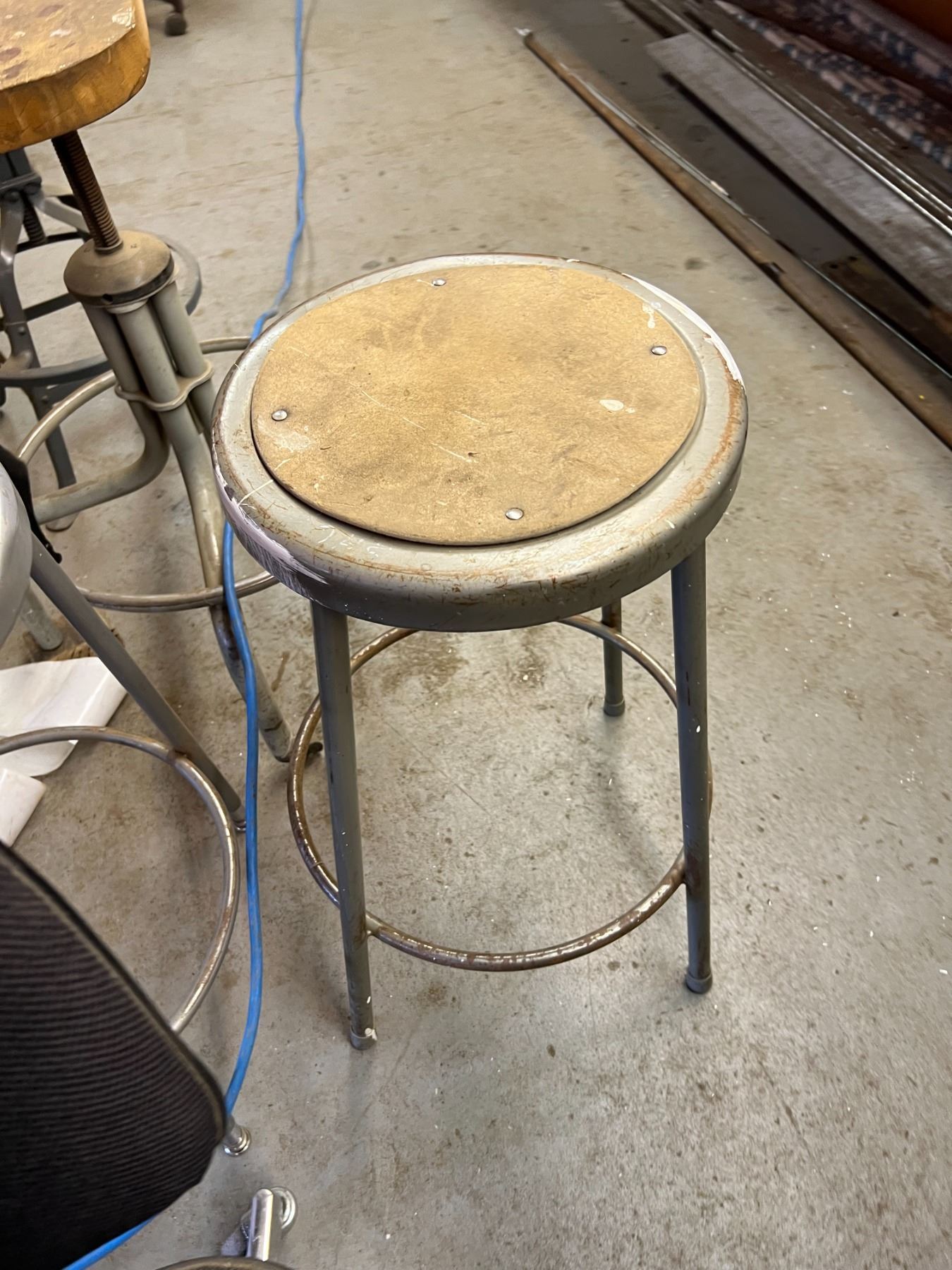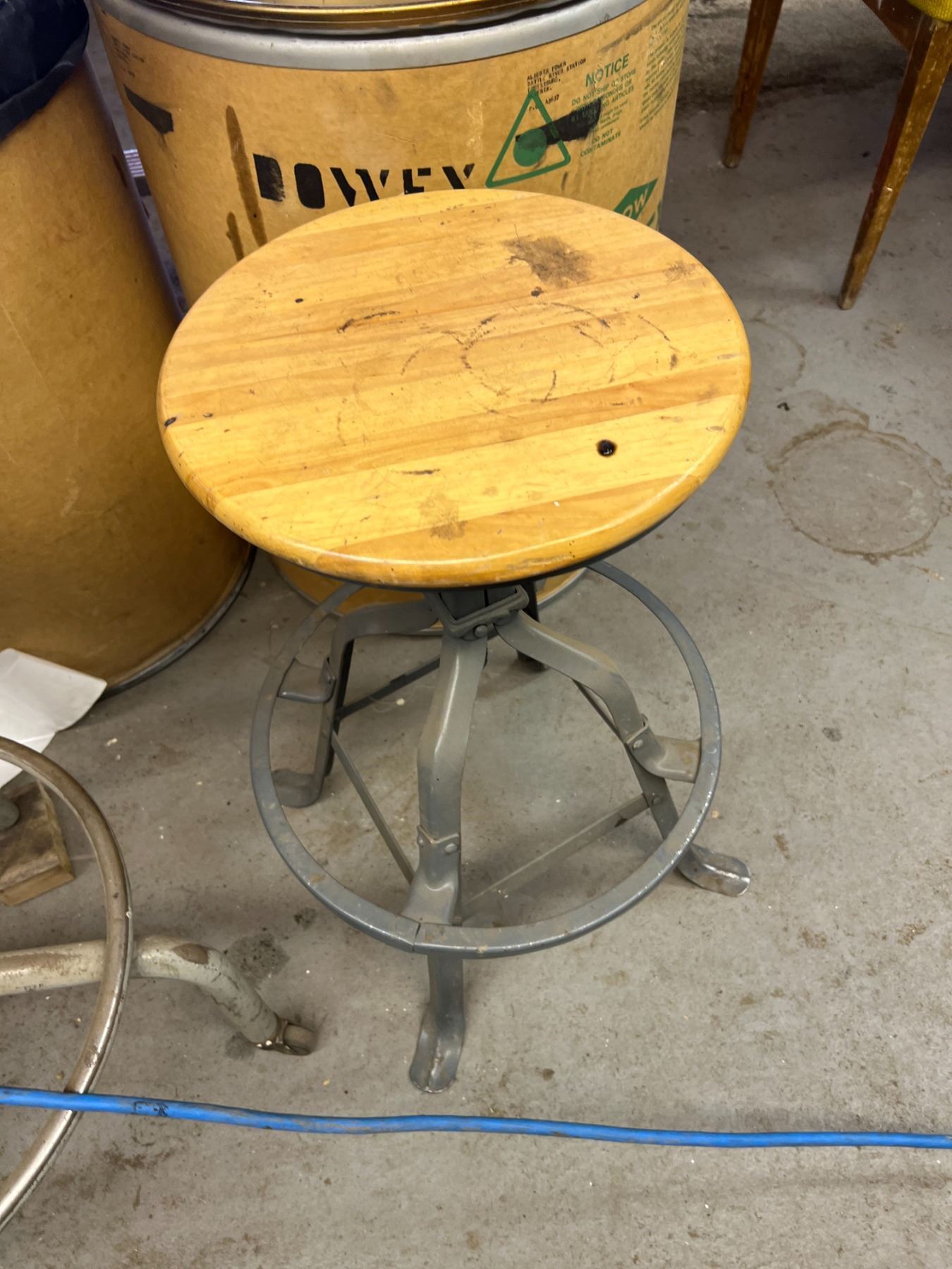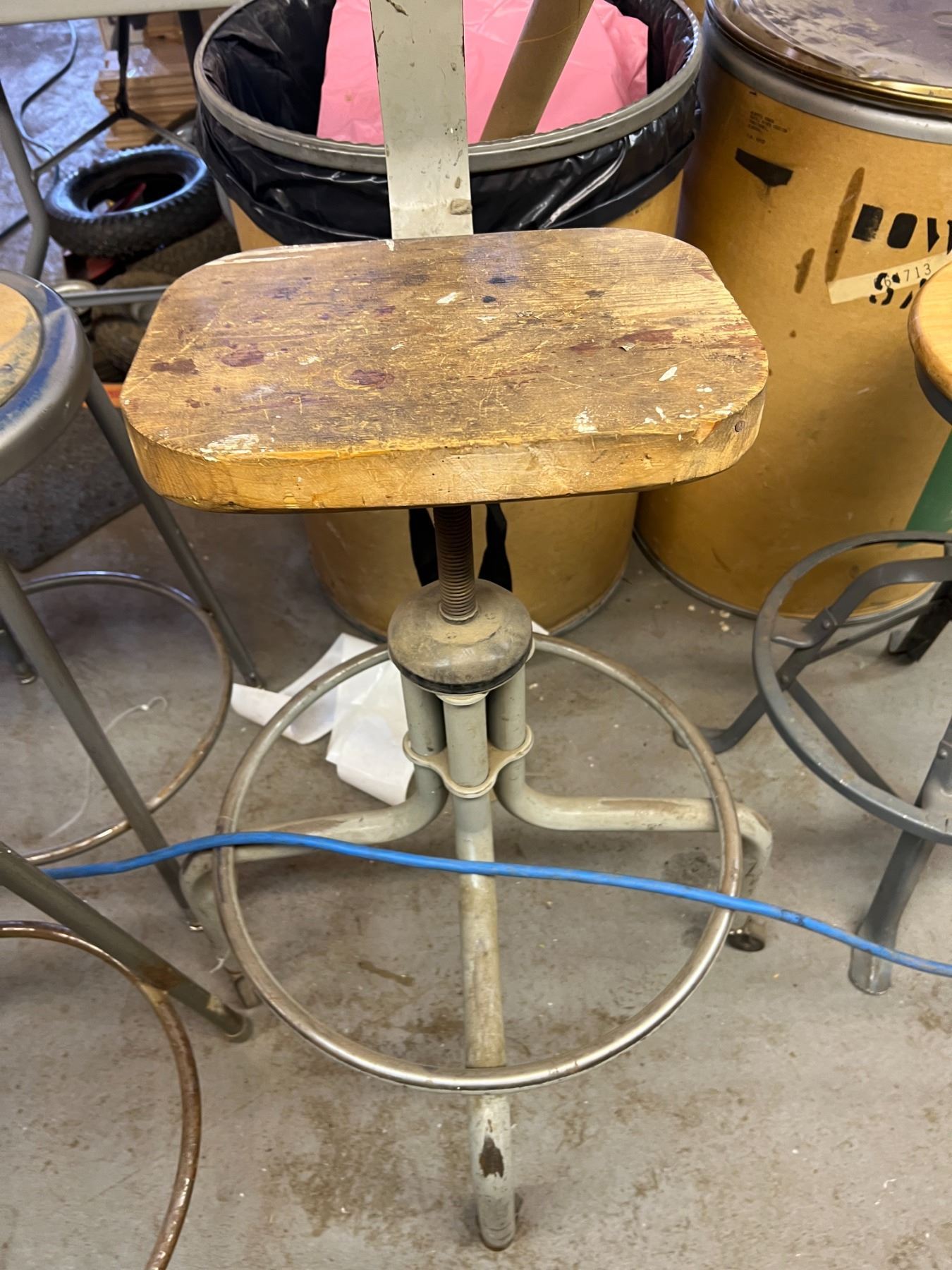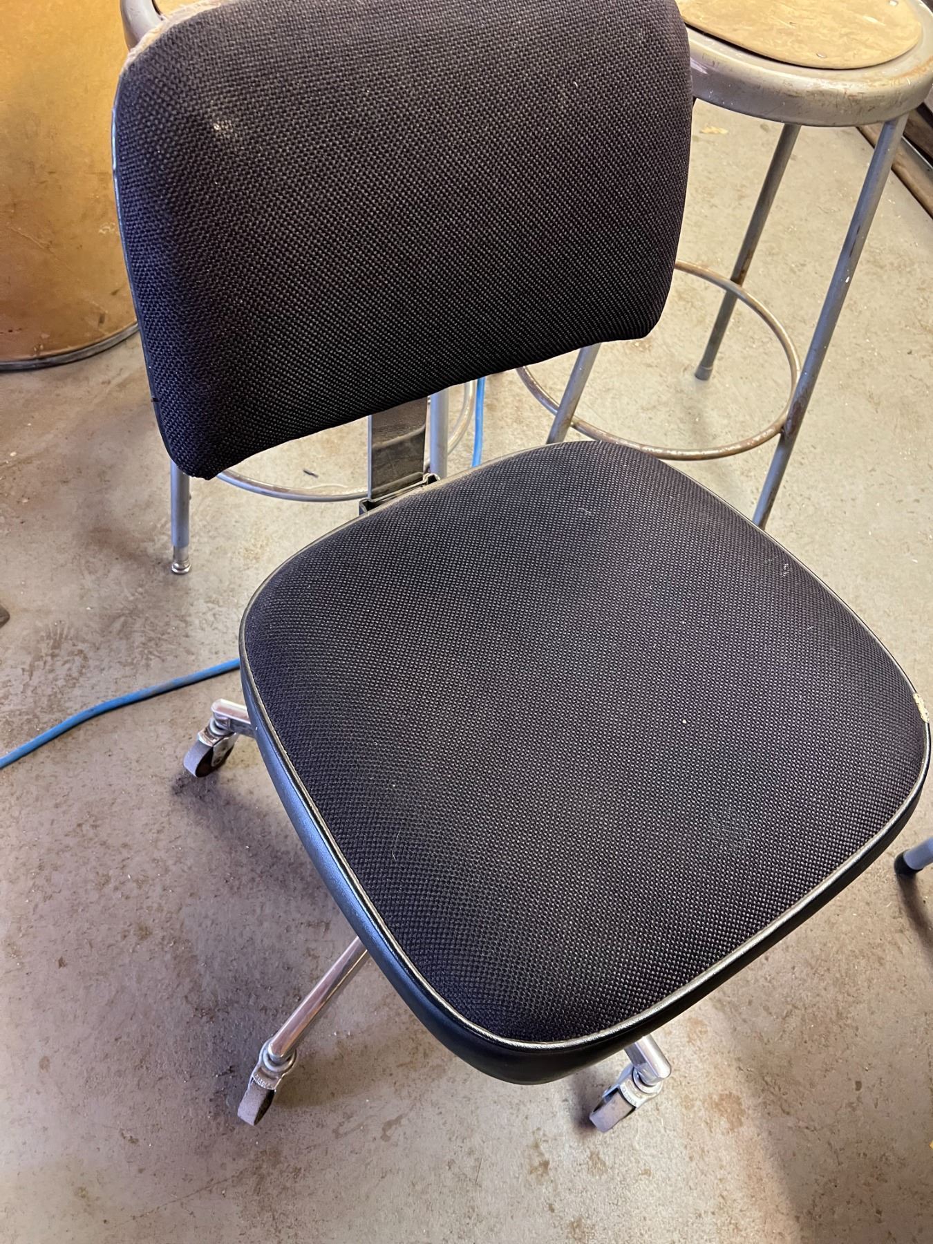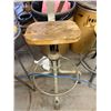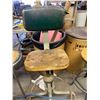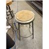 THREE STOOLS, OFFICE CHAIR AND WOOD CHAIR (NEEDS WHEEL)