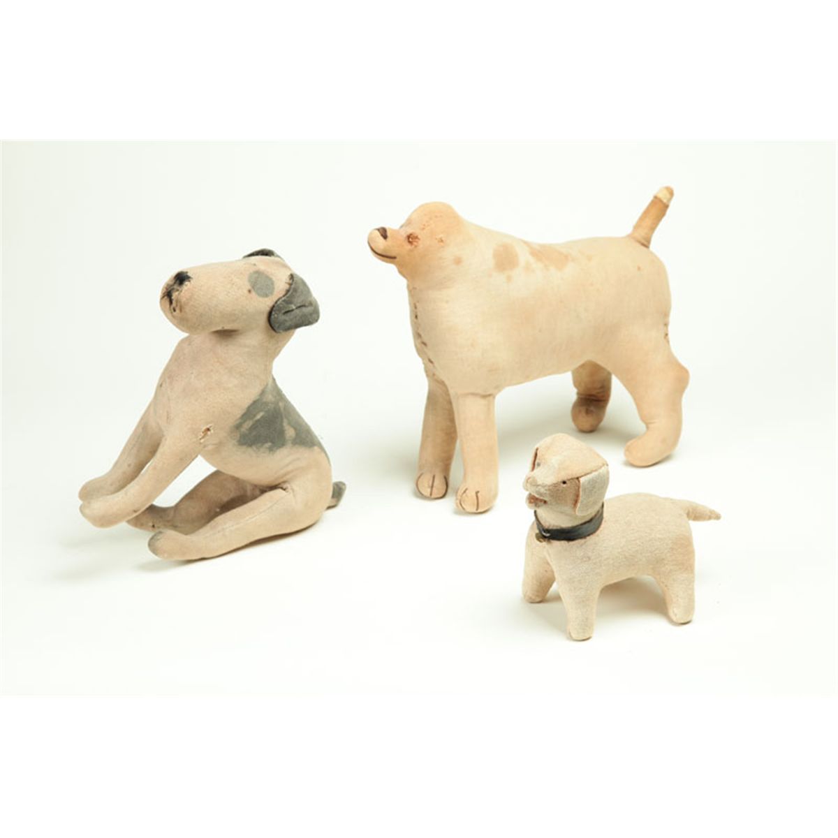 American, probably Amish or Mennonite, late 19th-early 20th century, cloth. All with wear, one with moderate losses. 11 1/2", 10 1/2" and 6 1/2"h.