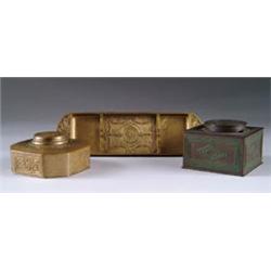 Lot 839 THREE TIFFANY DESK ACCESSORIES 1) Tiffany tray with three compartments with the center having a center medallion with a flower in gold dore finish. Stamped on underside “Tiffany Studios New York 1778”. SIZE: 9-1/2” l. CONDITION: Minor wear to dore finish, otherwise very good to excellent. 2) Tiffany zodiac inkwell with gold dore finish having a crab on the lid. Stamped on the bottom “Tiffany Studios New York 842”. SIZE: 2” t x 4” dia. CONDITION: Ink cup is missing, otherwise very good to excellent. 3) Square Tiffany inkwell with four line border with a three line diamond in centers of sides and lid with green patina. Stamped on bottom “Tiffany Studios New York 1801”. SIZE: 3-3/4” sq x 2-3/4” t. CONDITION: Some of the green patina in the line decoration is missing and some wear to finish on underside. Ink cup is missing. 5-70957