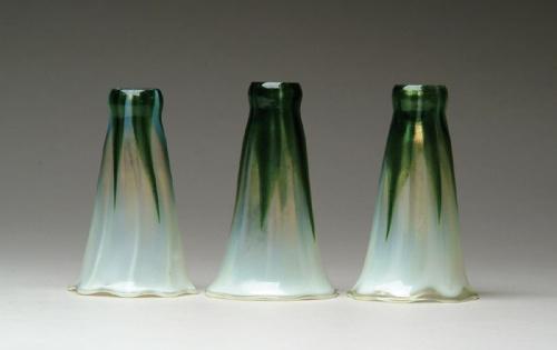 THREE TIFFANY LILY SHADES. Lot consists of three Tiffany lily shades having iridescent opalescence with green pulled feathers and scalloped edge. Signed "L.C.T.". SIZE: 4-1/4 in. t. CONDITION: Very good to excellent. Estate of Jon Heiden and Donald Mooers 5-60664-1233