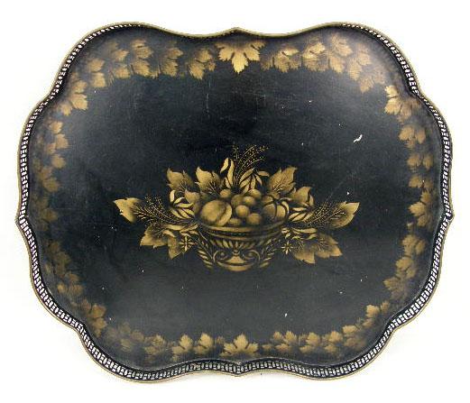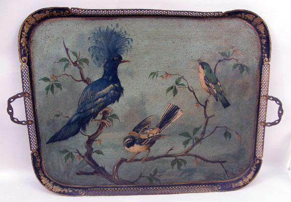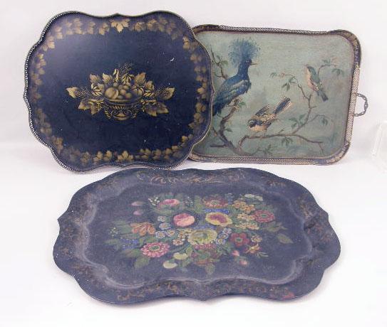 The first with Hitchcock-style stenciling in gold and bronze powders, the second with hand-painted birds, the third with hand-painted floral and gilt decorations. From 22"l x 17"w to 26"l x 19"w General wear and scratches commensurate with age and usage.