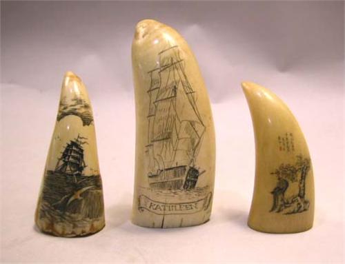THREE TOOTH-FORM SCRIMSHAWED ITEMS; two with scenes of ships, and the third, an Oriental scene, tallest, 4 3/4"l