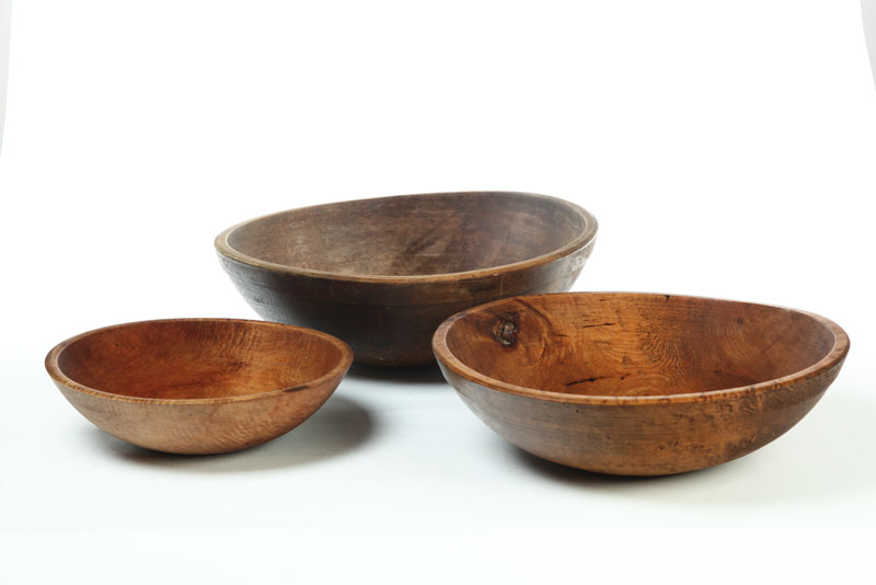 American, 19th century, maple with some figure. Curly maple with dry surface, 3 3/4"h. 13 1/4"d., and two with some bird's-eye. Refinished. 5 3/4"h. 17"d., 6 1/2"h. 19 1/2"d.