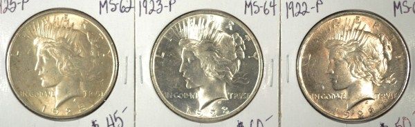 THREE UNCIRCULATED PEACE SILVER DOLLARS, 1922-P MS-63, 1923=P MS-64, 1925-P MS-62