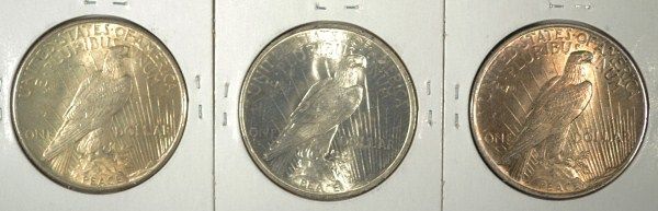 THREE GREAT PEACE DOLLARS TO ADD TO YOUR SILVER DOLLAR COLLECTION, ESTIMATE $135.00 TO $150.00