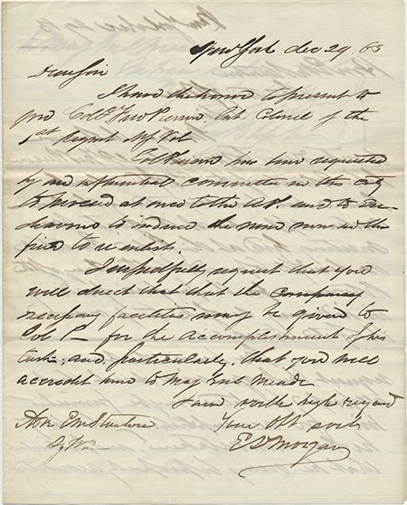 EDWIN D. MORGAN (1811-1883) Governor of New York from 1859 to 1862, U.S. Senator and Union major general. War-date A.L.S., 1p. 4to., New York, Dec. 29, 1863, to Secretary of War Edwin Stanton: "...I have the honor to present to you Col. J. Fred Pierson, late Colonel of the 1st Regmt NY Vol. Col. Pierson has been requested by an influential committee in the city to proceed at once to the AP and to endeavor to induce the men now in the field to re-enlist...". Endorsed on verso by brigadier general JAMES ALLEN HARDIE (1823-1876) who served on the staffs of McClellan, Burnside, and Hooker. Also present: AMOS BEEBE EATON (1806-1877) Union brigadier general, L.S., 2pp. 4to., New York, Dec. 29, 1863 to Col. Pierson, asking him to convince the enlisted soldiers, who have their terms expiring, to re-enlist in the New York regiments. Two pieces, fine.