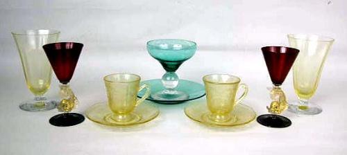 THREE VENETIAN-STYLE RUBY AND DOLPHIN-FORM CORDIALS TOGETHER WITH a group of amber and green glassware, losses