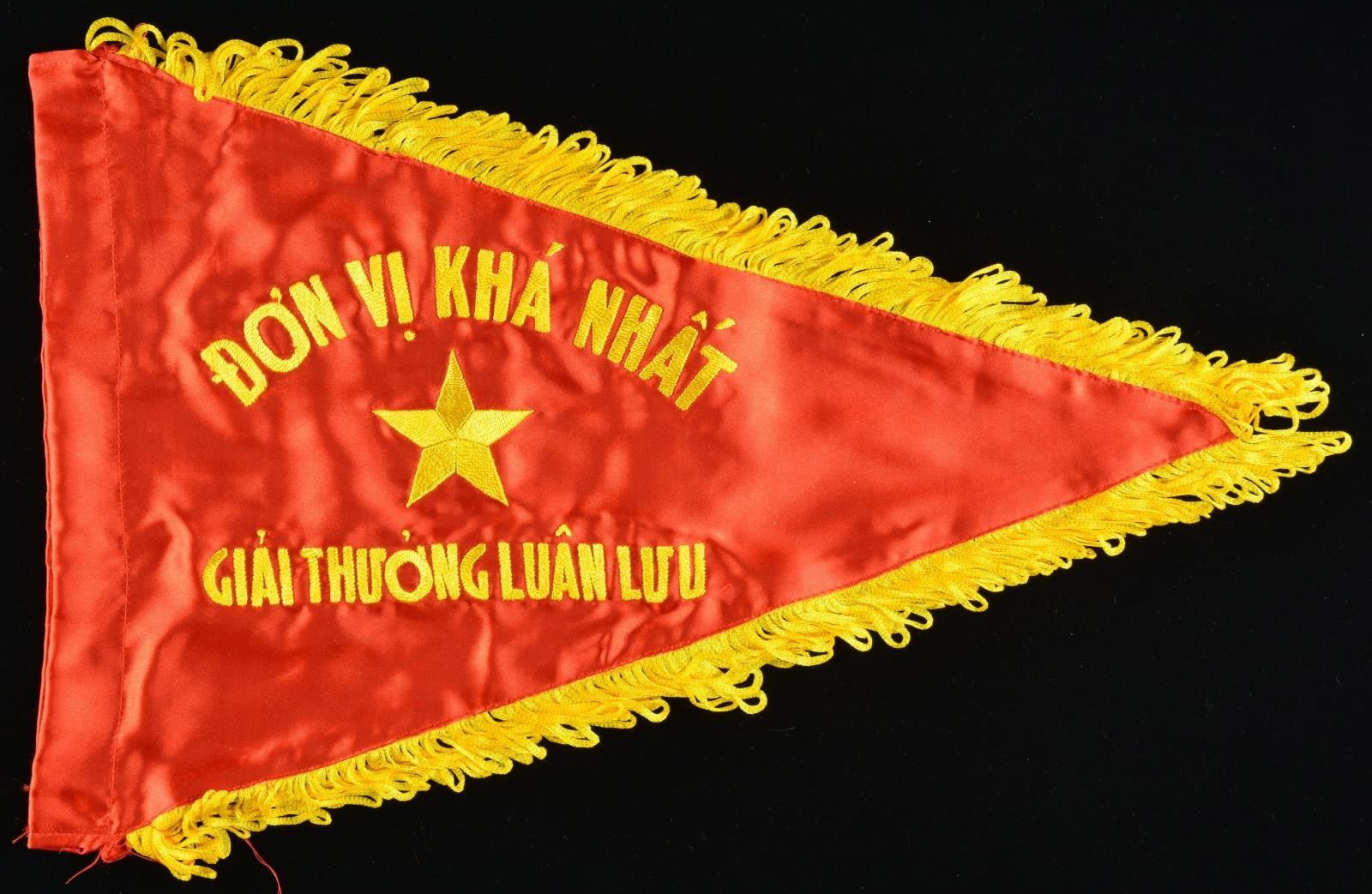 1. 12" x 20" gold embroidered red silk triangular guidon, translates: "Best Unit, Award rotation,