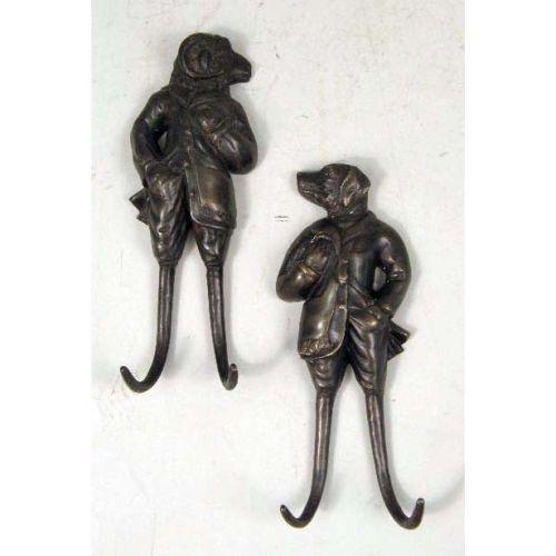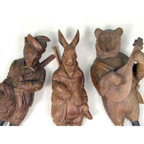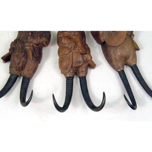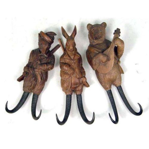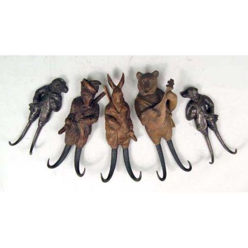 THREE VINTAGE BLACK FOREST CARVED WOODEN WALL HANGERS<BR><BR>In the shapes of a bear playing a lute, a rabbit, and a fox. Each with glass eyes and two chamois horns for hanging hooks. Together with two similar hangers in bronze, one depicting a dog, the other a ram. Bear: 16"l. 5 pieces
