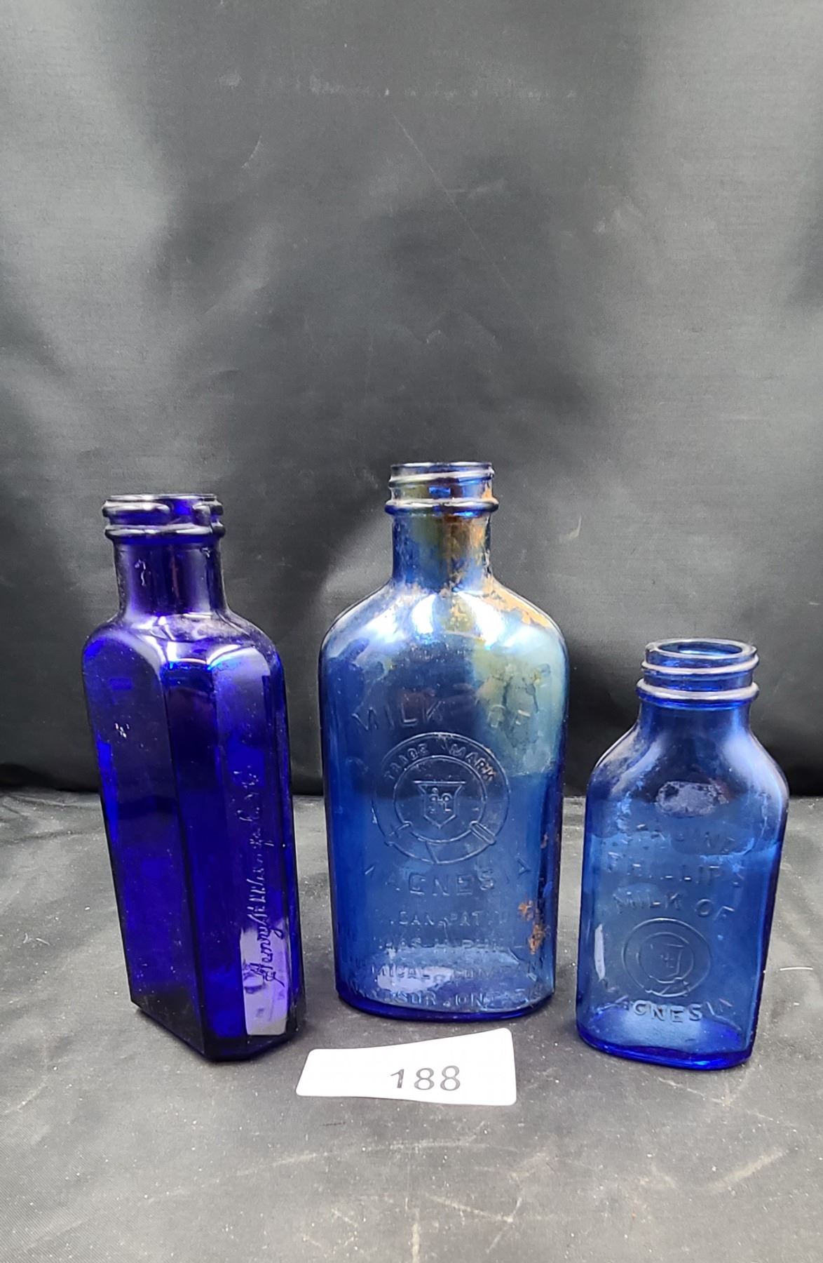 THREE VINTAGE COBALT BLUE GLASS MILK OF MAGNESIA BOTTLES