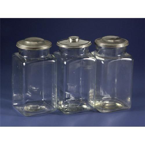 Three vintage glass cookie or biscuit jars with metal lids, each measures approx 9.5'' x 4.5'' x 4.5''.