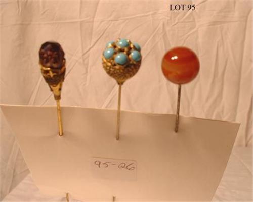 1 GILT METAL W/ MUTLI-FACETTED AMETHYST - 9" L; 1 AGATE BALL- 6" L; 1 GILT FILIGREE W/ BLUE STONES - 6 3/4" L