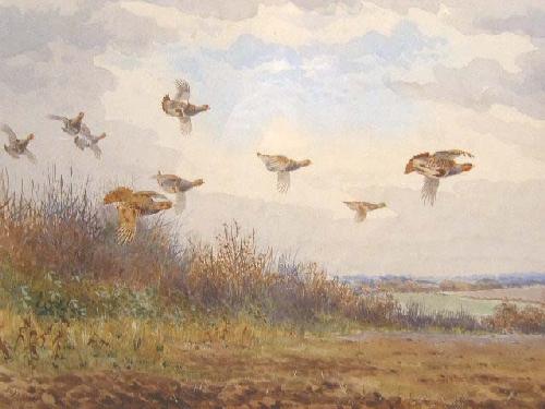 THREE WATERCOLORS, "GROUSE IN FLIGHT"; Signed J.C. Harrison, each inscribed on the back, "Treman Gallery, Dover Street, London." 13"h x 18 1/2"w
