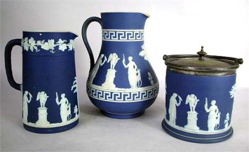 THREE WEDGWOOD, ENGLAND BLUE JASPERWARE ITEMS; Comprising: 2 Pitchers and a covered biscuit jar, tallest, 9"h, losses and repair