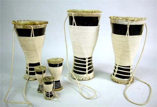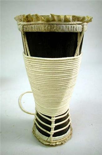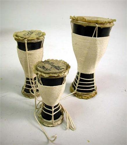 THREE WOOD, CORD, AND SKIN DRUMS Cuba '85, one inscribed Itotle, the next Iya, and the last Okonkolo, together with three miniature versions, from 34"h to 16"h, 6 pieces