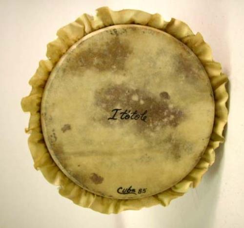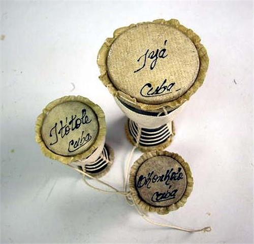 THREE WOOD, CORD, AND SKIN DRUMS Cuba '85, one inscribed Itotle, the next Iya, and the last Okonkolo