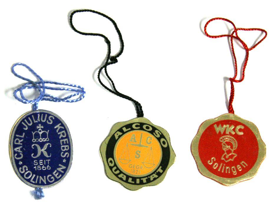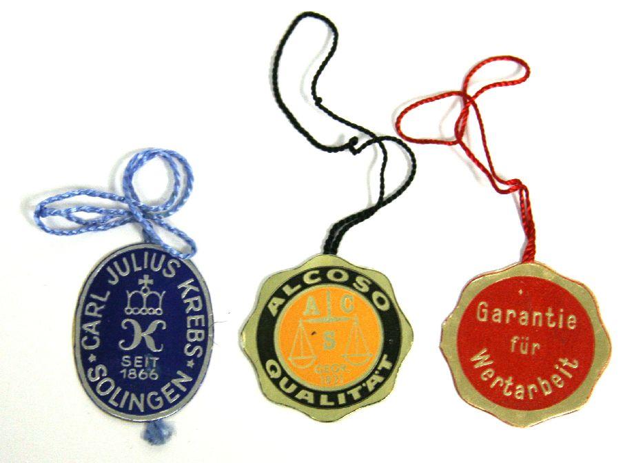 A rare lot of three quality control tags from makers of Third Reich daggers. Alcoso, Krebs, and WKC. Very good condition.