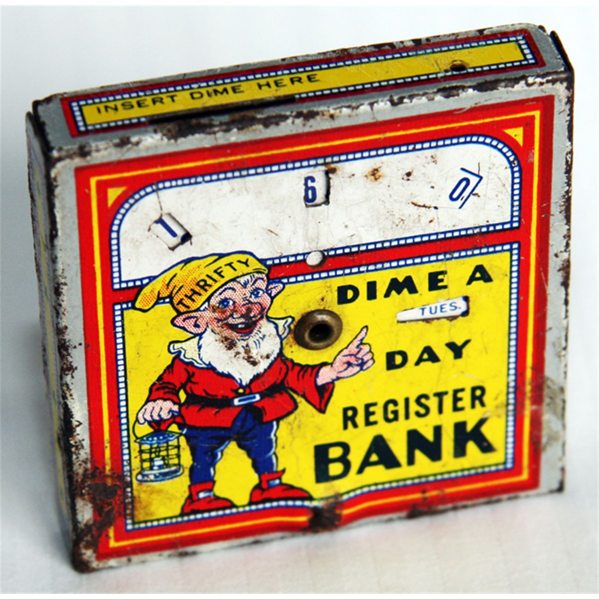 THRIFTY ‘DIME A DAY’. A Square Register Bank. Ten cent slot on top. No serial number. 6cm x 6cm x 1cm. Maker unknown. No patent information. VG.