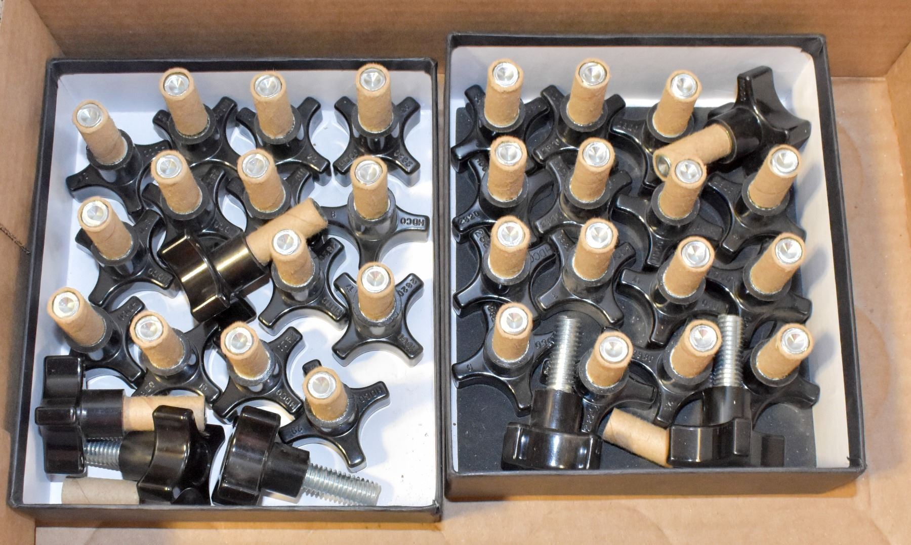 NEW PLASTIC KNOBS WITH THREADED STEM. 1.5" W X 2"TALL. THREADED PART 1". DIAMETER 3/8". QUANTITY: 26 PCS